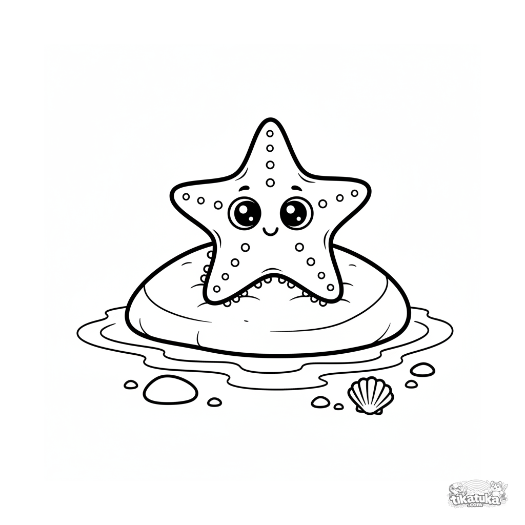 Página para colorir de uma estrela-do-mar tomando sol em uma rocha quente na água muito rasa sob o sol.