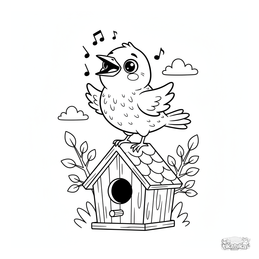 Página para colorir para crianças 7-9: um estorninho brilhante canta alegremente enquanto está em pé no telhado pontiagudo de uma casa de pássaros de madeira. Pose expressiva e detalhes das penas.