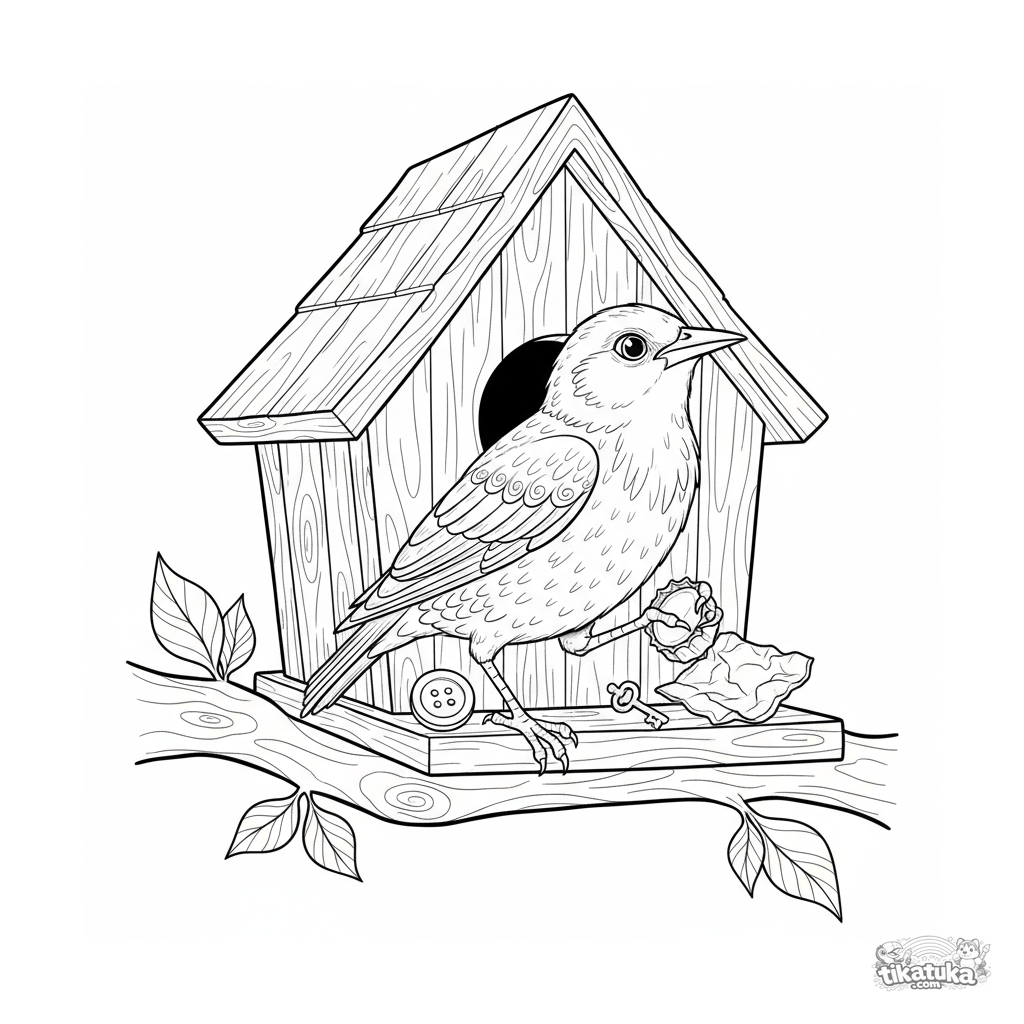 Página para colorir detalhada para crianças mais velhas 10-12: um estorninho a decorar a entrada de uma casa de pássaros com objetos brilhantes - uma tampa, botão, folha.