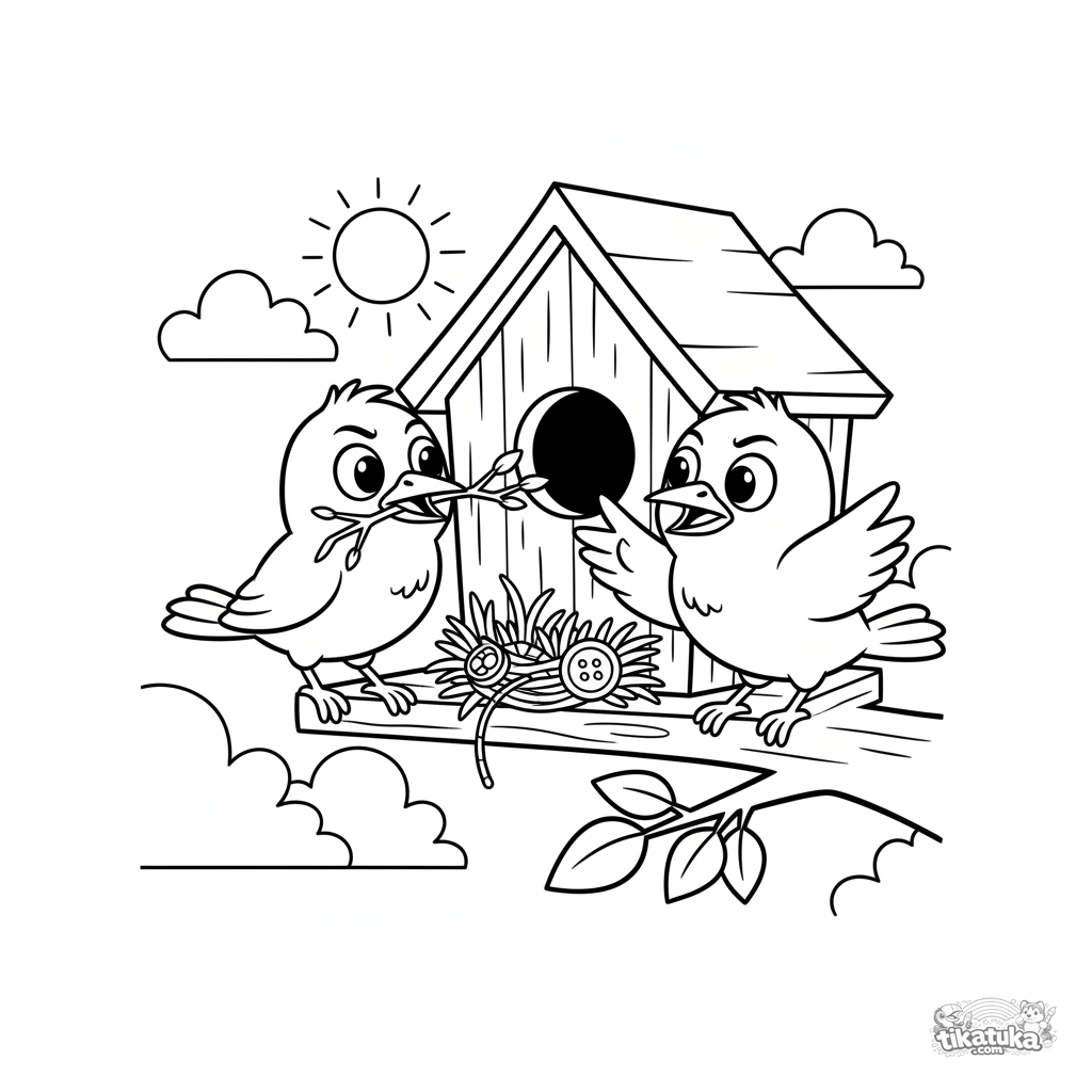 Página para colorir para crianças de 7 a 9 anos no estilo Hanna-Barbera: dois estorninhos têm uma discussão cômica no poleiro de uma casa de pássaros por material de ninho.