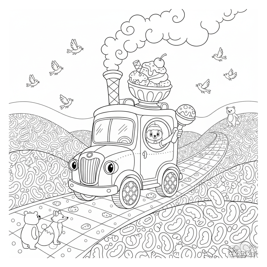 Página para colorir para meninos: um caminhão de sorvete a vapor com rodas de cone dirige por colinas de jujubas. Para crianças de 6 a 9 anos.