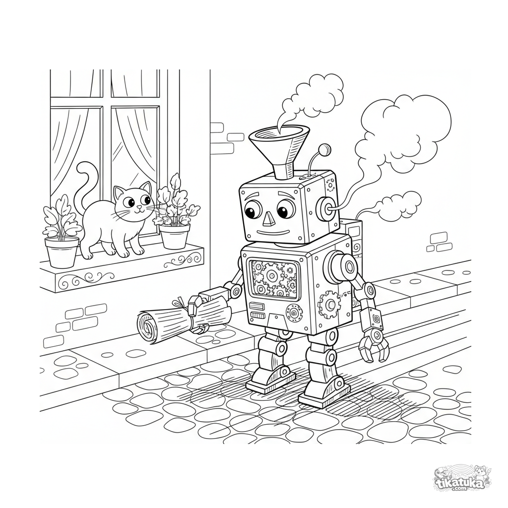 Uma página para colorir de Robôs com nível Difícil. Ela combina com a idade 7+ anos, imprime bem em casa e abre imediatamente no modo online.