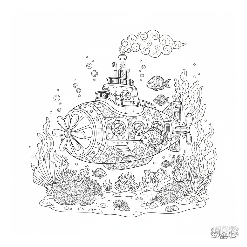 Página para colorir de um submarino vitoriano a vapor explorando um recife de coral. Para crianças de 8 a 12 anos.
