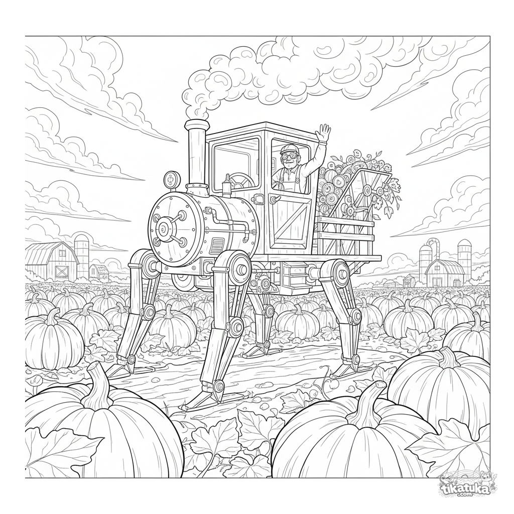 Página para colorir difícil para crianças de 8-12 anos: um trator fantástico a vapor com pernas de pistão colhe abóboras gigantes em um campo, dirigido por um engenheiro com óculos acenando da cabine.