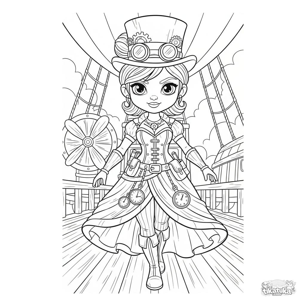 Página para colorir estilo quadrinhos: uma exploradora steampunk em uma roupa detalhada com engrenagens caminha pelo convés de um dirigível. Figura completa, fundo com hélices, para meninas 10-12.