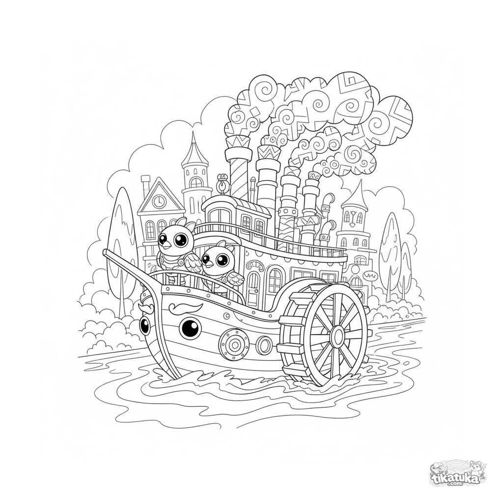 Página para colorir steampunk intrincada para crianças mais velhas de 10 a 12 anos: um vapor de rodas mecânico detalhado navega em um rio.