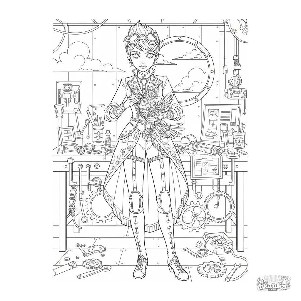 Página para colorir detalhada para crianças de 10-12 anos: uma princesa steampunk monta um pássaro de corda em uma oficina a bordo de um aeróstato.