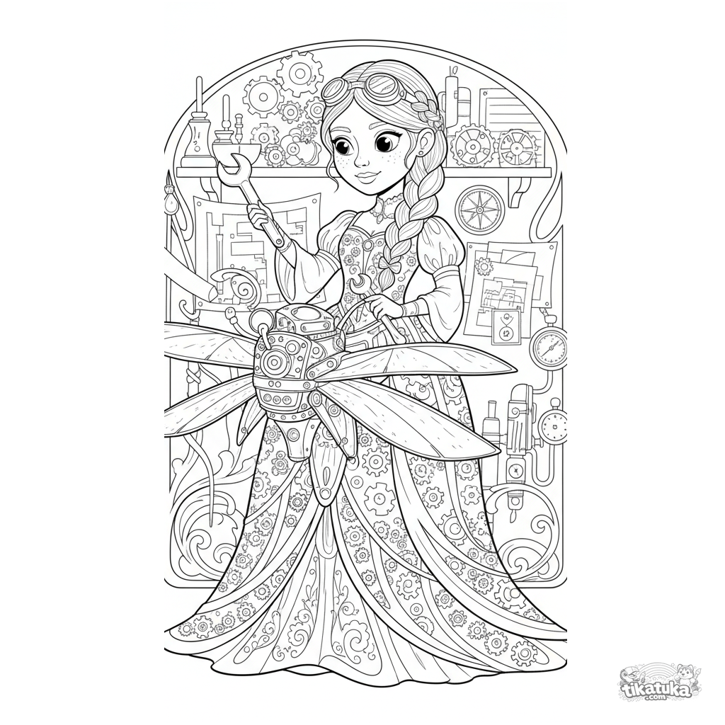 Página para colorir para 10-12 anos: uma princesa steampunk inventando uma máquina voadora em sua oficina cheia de plantas e ferramentas de latão.