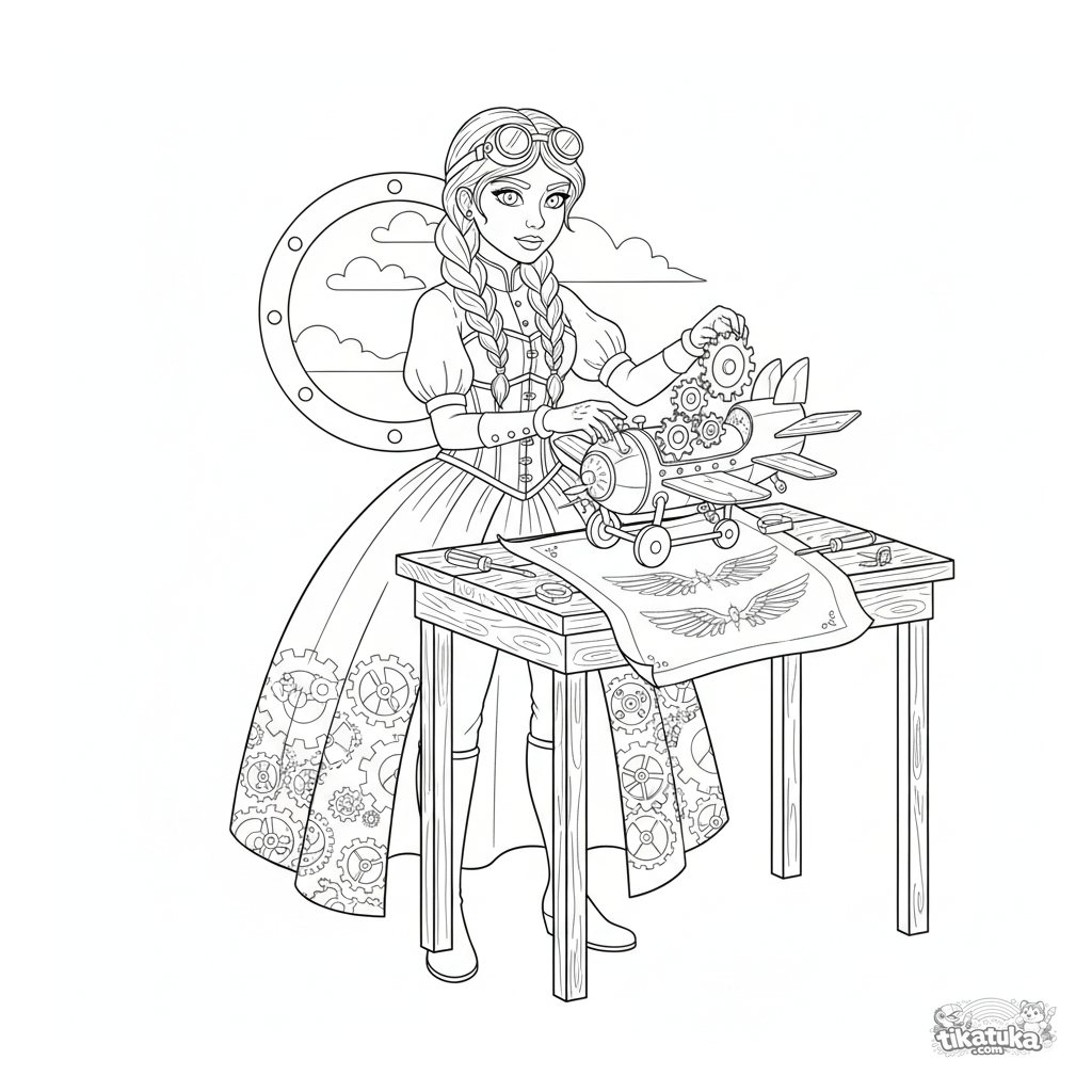 Página para colorir para crianças mais velhas 10-12: uma princesa steampunk consertando uma máquina voadora em sua oficina no céu. Plantas detalhadas e ferramentas.