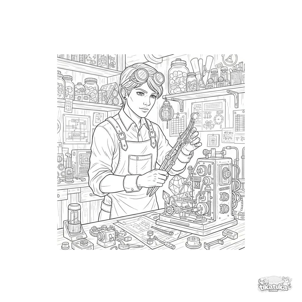 Página para colorir para crianças 10-12: um inventor steampunk monta um dispositivo de cristal de dados em uma oficina no porão. Muitos detalhes: ferramentas, plantas, engrenagens.