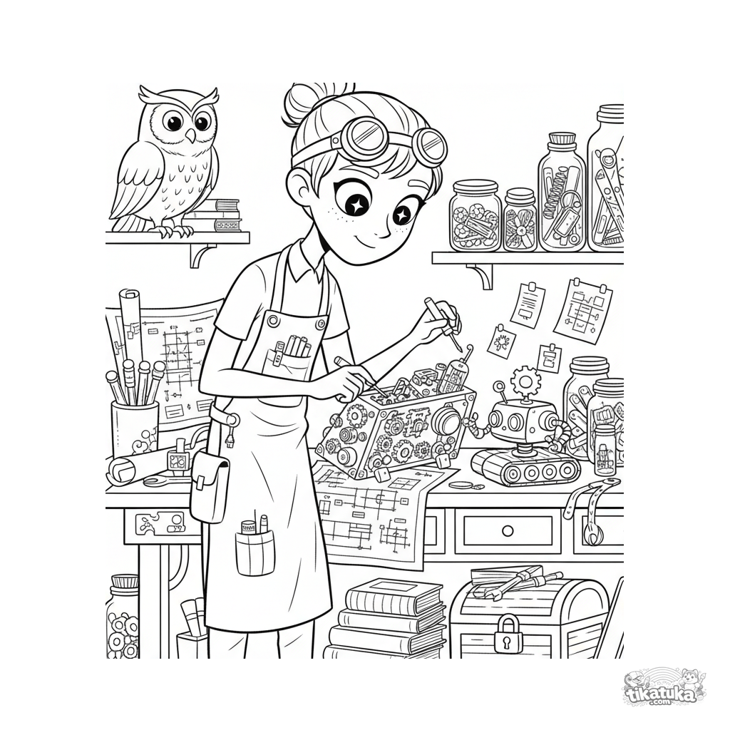 Página para colorir de fantasia: um inventor steampunk montando um cyberdeck de latão em um laboratório no porão. Muitos detalhes: engrenagens, tubos, ferramentas.