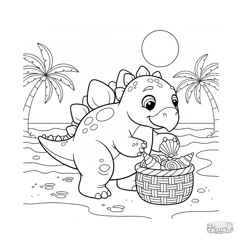 Página para colorir para pré-adolescentes de 7-9 anos: um estegossauro coleta conchas em uma cesta em uma praia arenosa oceânica antiga. Pose expressiva, detalhe moderado, personagem amigável.