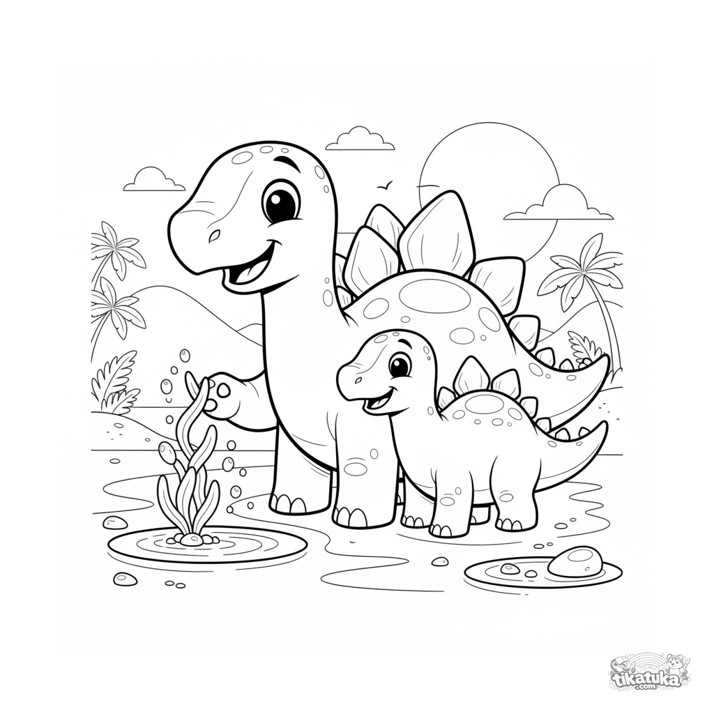 Página para colorir para crianças de 4-6 anos: uma família fofa de estegossauros, um adulto e um filhote, brinca com algas na beira da água de uma praia antiga. Cena familiar aconchegante.