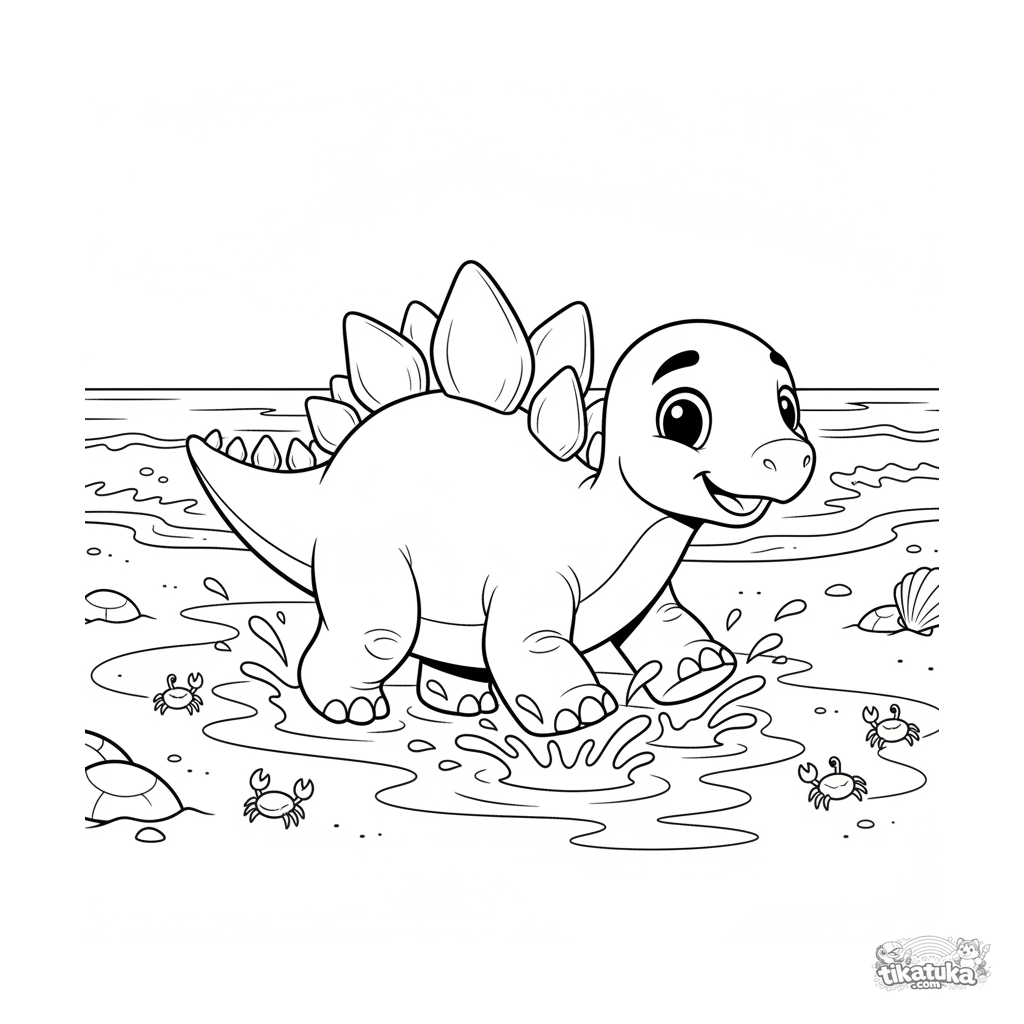 Página para colorir para 7-9 anos: um jovem stegossauro brinca alegremente em poças de maré na praia arenosa de um oceano antigo.