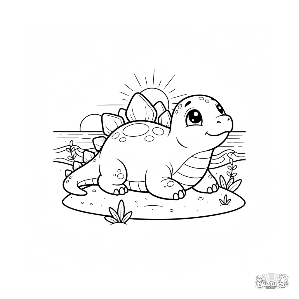 Página para colorir para crianças de 4-6 anos: um aconchegante estegossauro com placas toma sol pacificamente, deitado numa duna arenosa com vista para o oceano antigo.