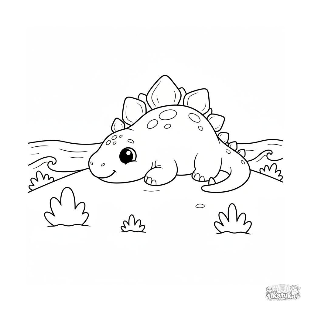 Página simples para colorir para crianças pequenas de 2-3 anos: um grande estegossauro descansando numa duna de areia junto a um oceano antigo.
