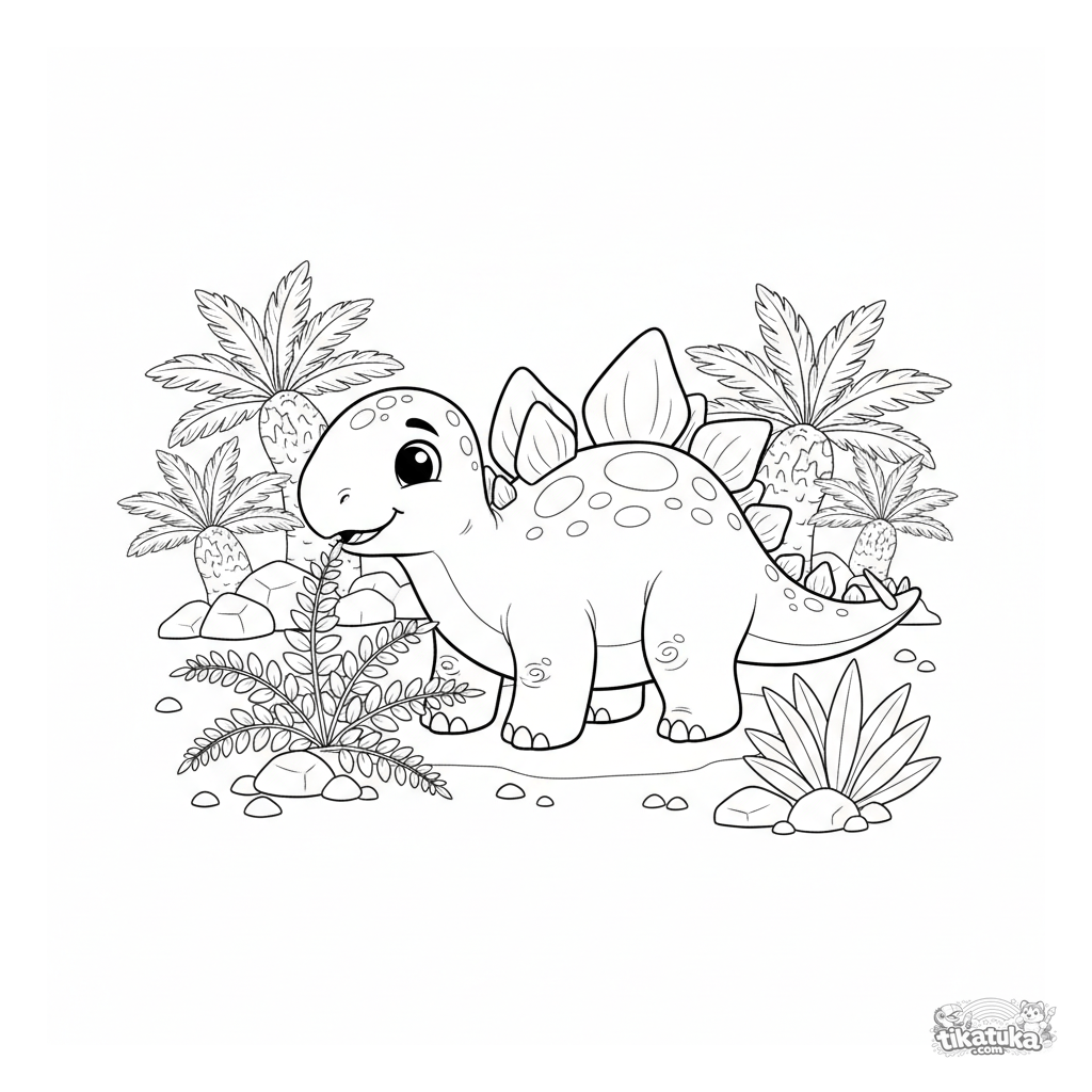 Página para colorir para crianças de 4-6 anos: um fofo estegossauro com placas nas costas mordisca samambaias em uma clareira ensolarada. Cena simples e cativante.