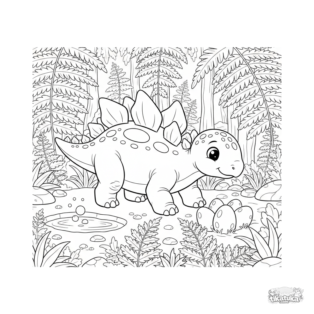 Página para colorir para crianças de 4-6 anos: um estegossauro amigável com placas nas costas caminha em uma floresta pré-histórica de samambaias. Formas simples e contornos claros.