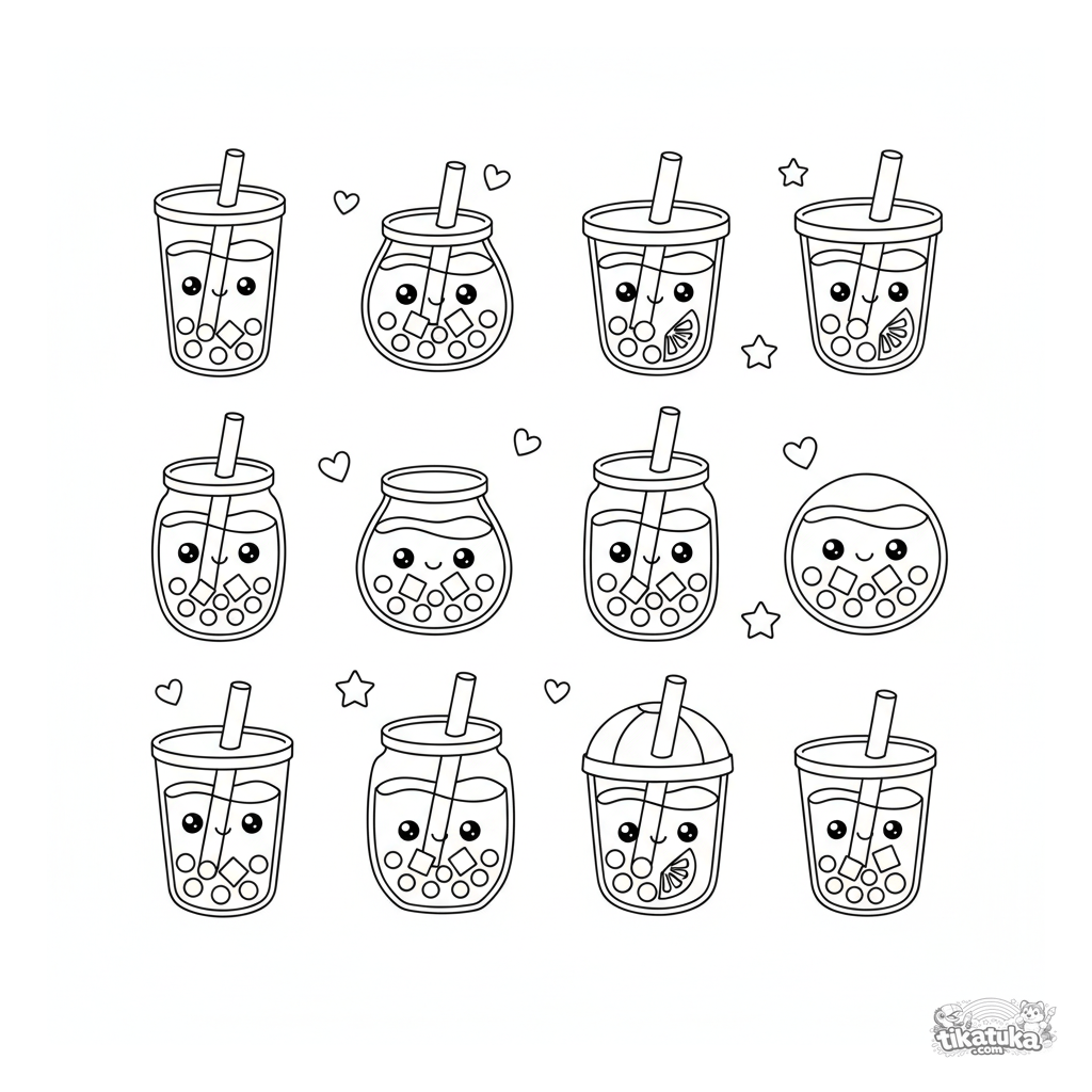 Folha de adesivos para colorir para crianças 4-6: 12 bebidas boba fofas diferentes com coberturas e acessórios. Cada item é separado, perfeito para colorir ou recortar.