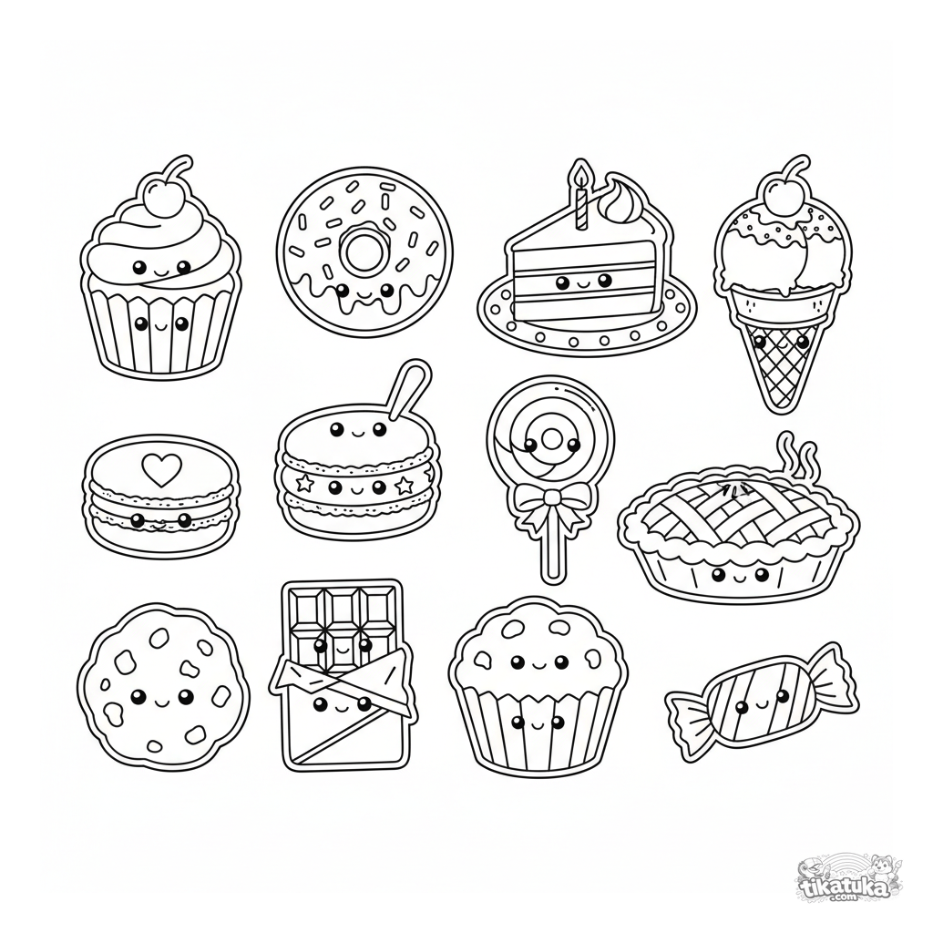 Página para colorir tipo folha de adesivos para crianças de 7-12 anos: 12 sobremesas kawaii separadas (cupcake, donut, sorvete, etc.) com rostos fofos, espaçadas uniformemente na página.