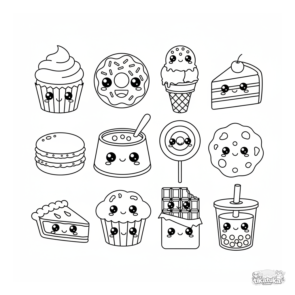 Página para colorir tipo folha de adesivos: 12 sobremesas kawaii como cupcake, donut e sorvete. Perfeito para crianças que amam doces.