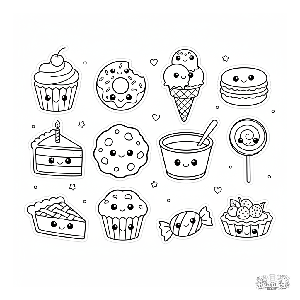Página para colorir projetada como uma folha de adesivos com 12 personagens de sobremesa kawaii fofos com rostos felizes. Para crianças de 4 a 6 anos.