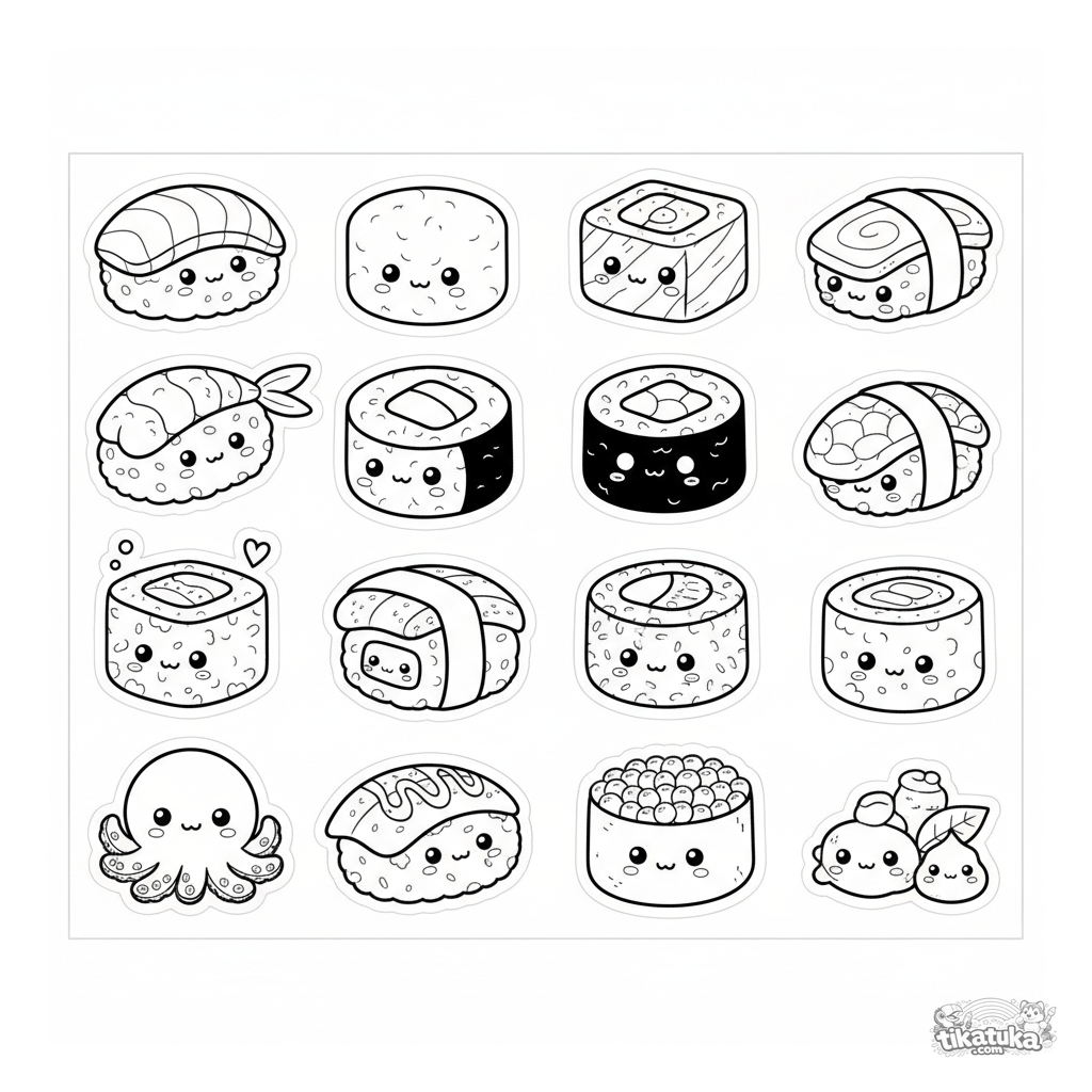 Página desafiante de folha de adesivos para colorir para crianças de 7-12 anos com 12 itens de sushi kawaii. Cada item está separado para colorir e recortar.
