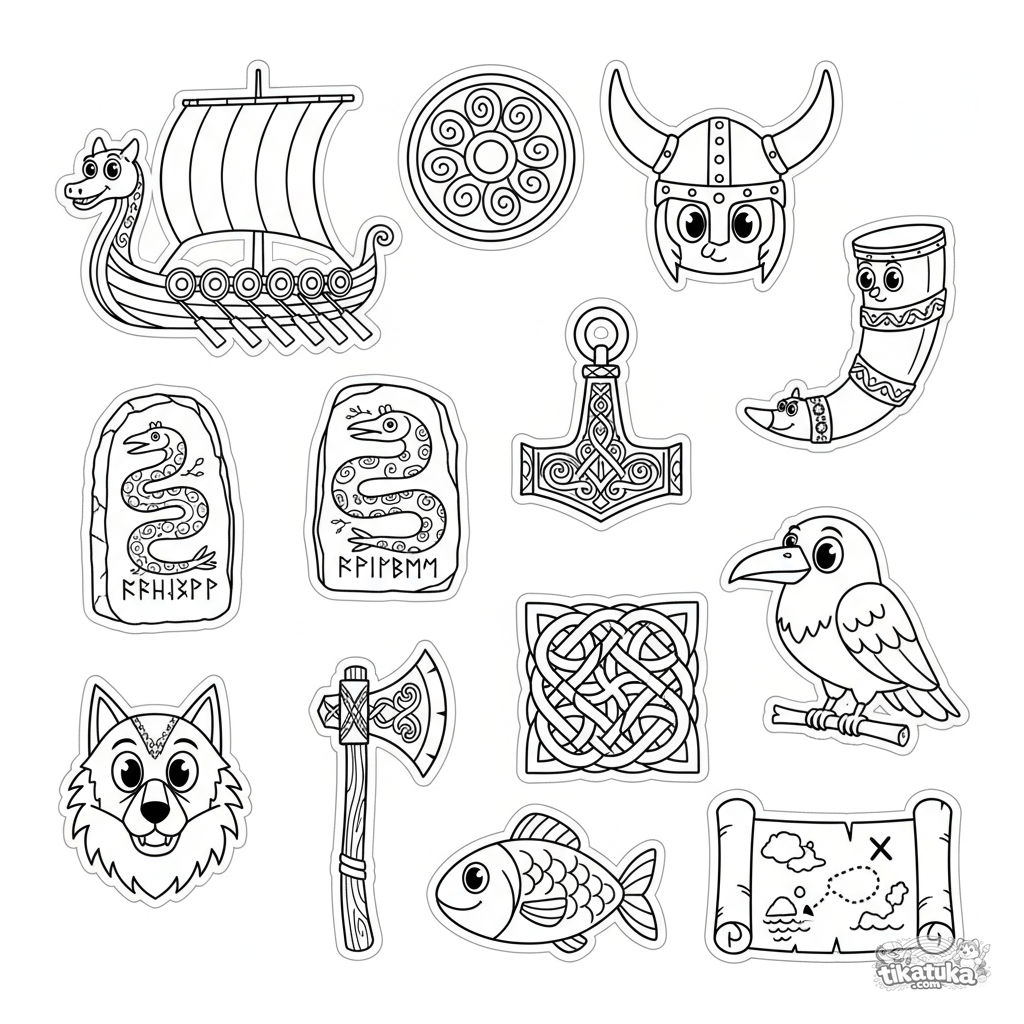 Folha para colorir difícil com 12 itens separados com tema viquingue para 7-12 anos: navio longo, escudos, símbolos e amuletos, perfeito para recortar e colorir.