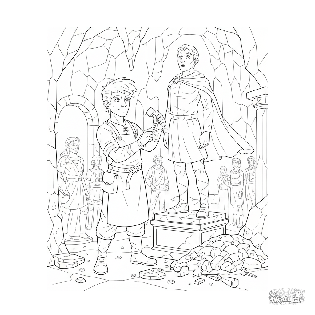 Página para colorir complexa para crianças de 10-12 anos: um escultor de pedra mítico trabalhando no covil da Górgona. Muitos detalhes em ferramentas e estátuas.