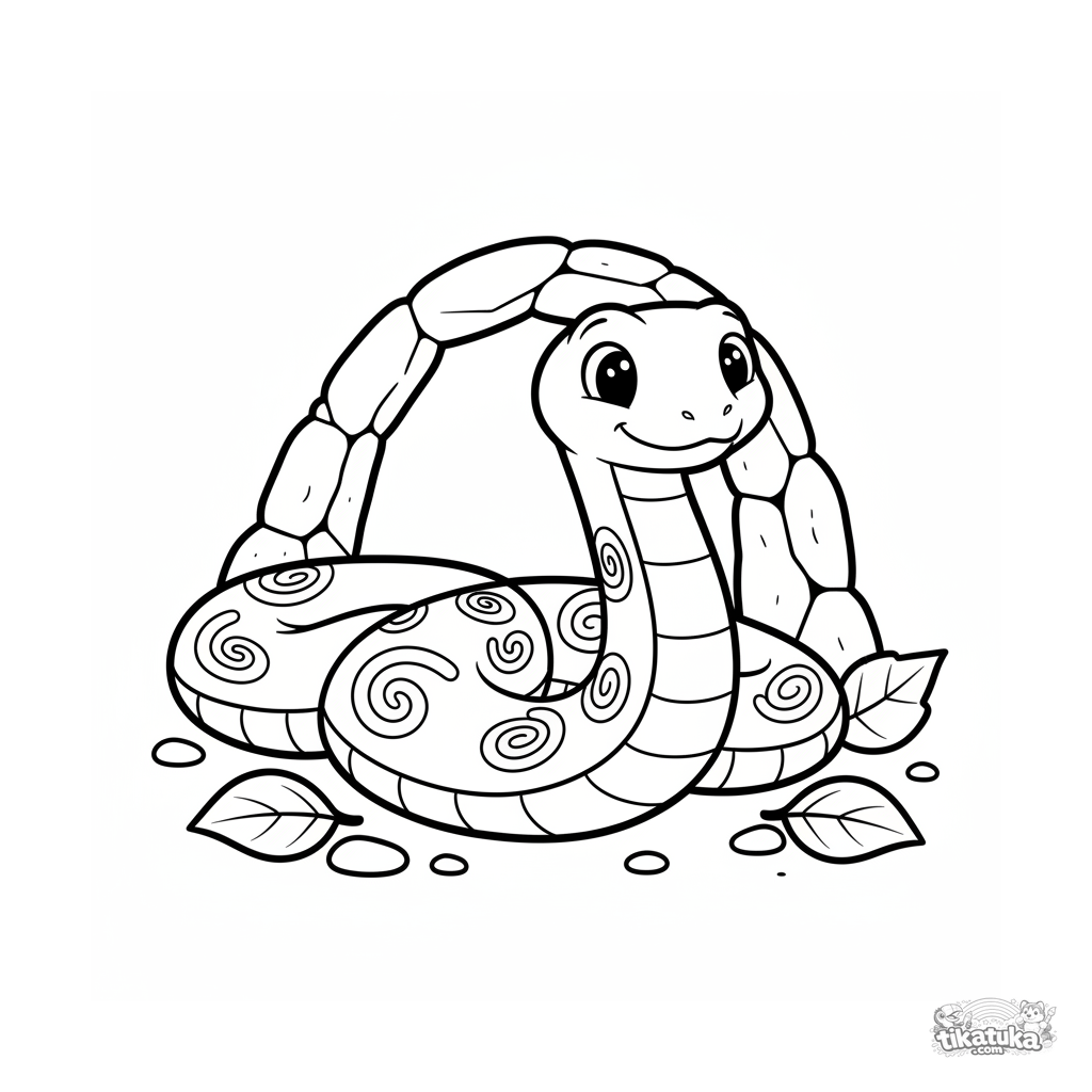 Página simples para colorir para bebês 2-3: uma cobra de pedra amigável com padrão espiral guarda a entrada do covil. Formas grandes e claras para primeira coloração.