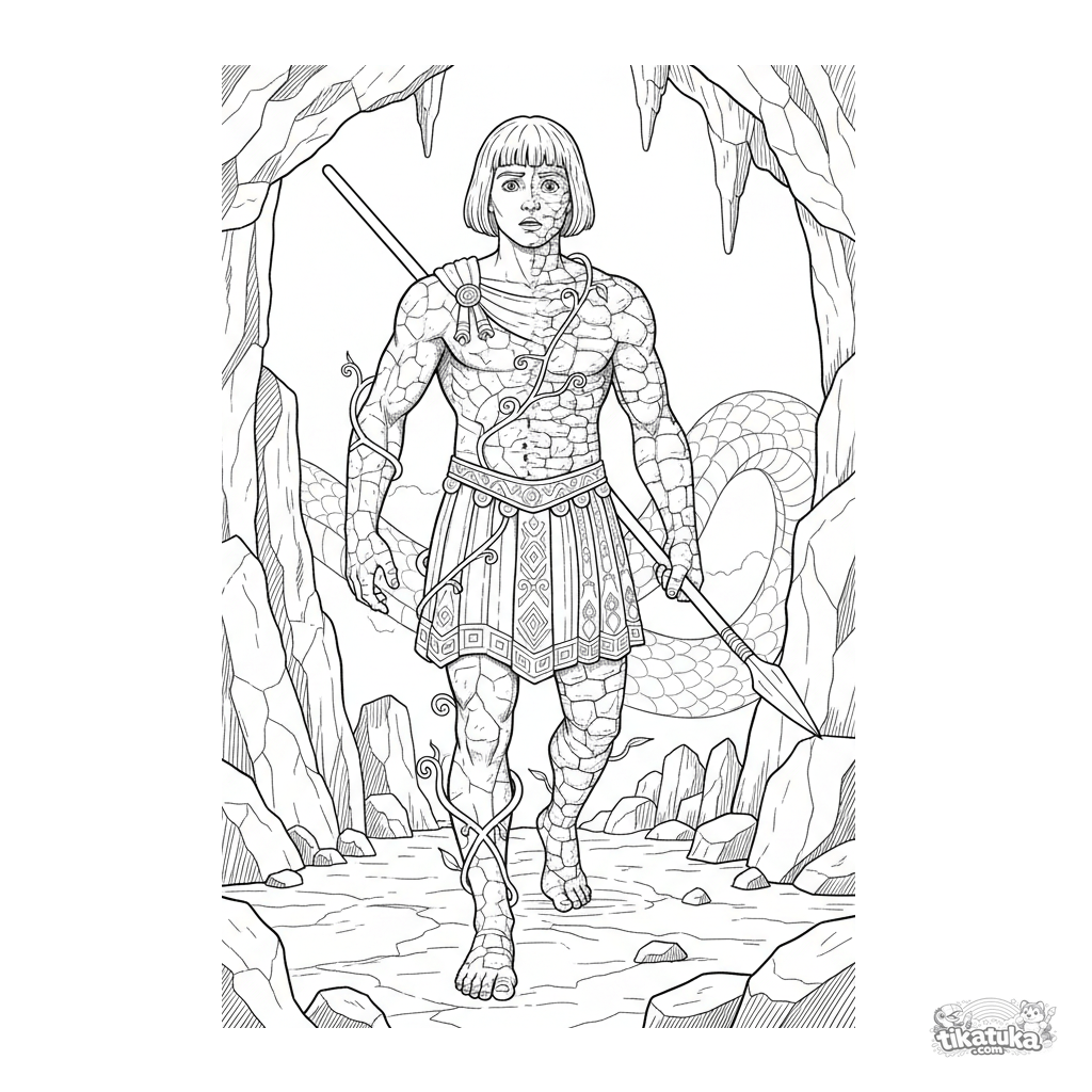 Página complexa para colorir para crianças de 10-12 anos: guerreiro parcialmente transformado em pedra pelo olhar da Medusa. Texturas de pedra e carne.