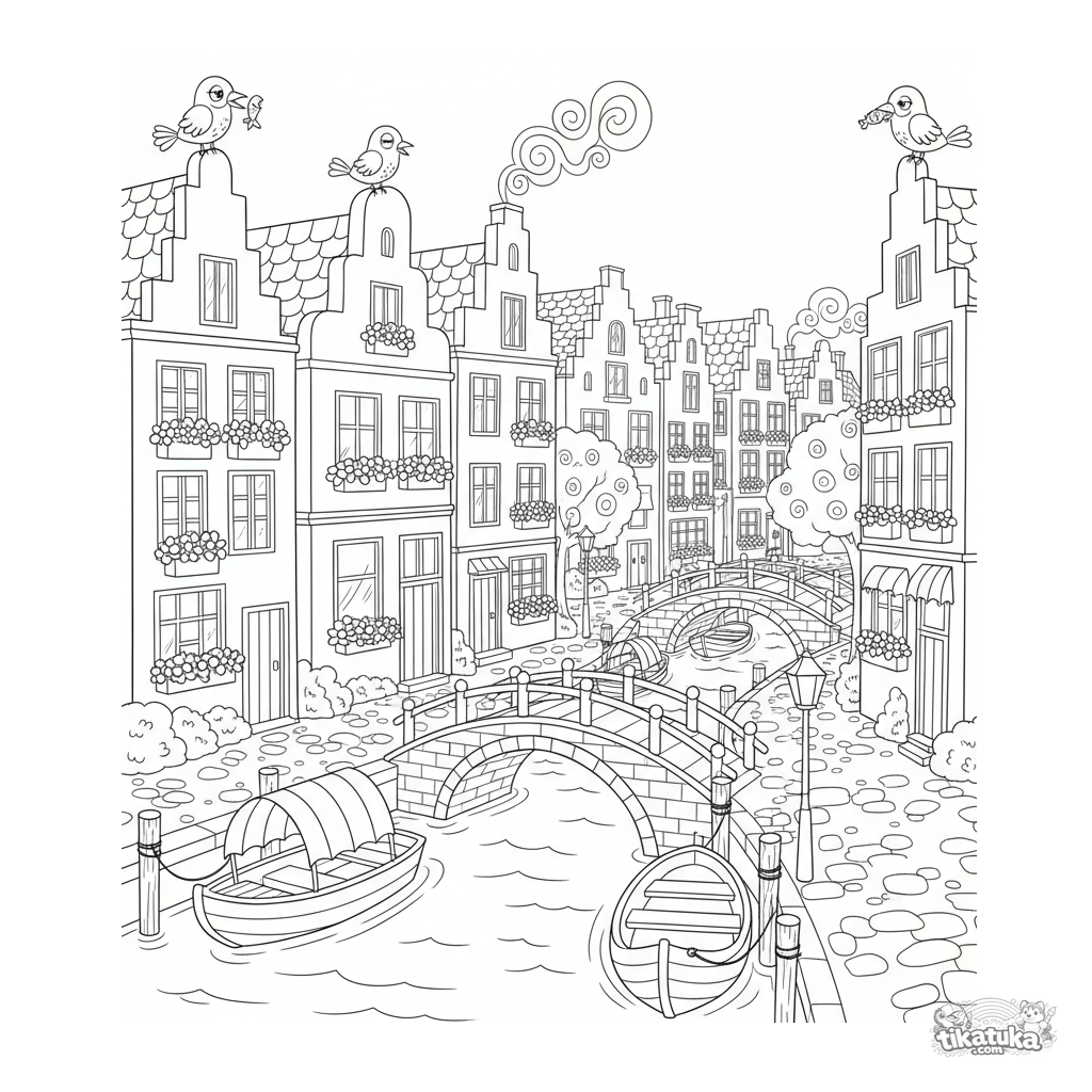 Página para colorir detalhada de um bairro de canais de conto de fadas para crianças de 7 a 12 anos. Com casas estreitas, pontes arqueadas, barquinhos e floreiras nas janelas.