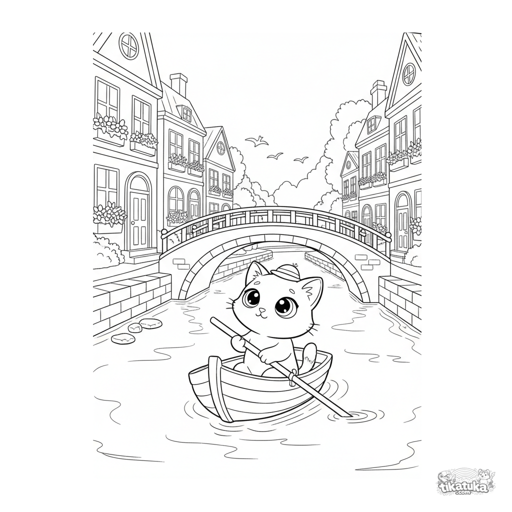 Página para colorir para crianças 4-6: um bairro de canal aconchegante, um gato curioso de chapéu flutua em um barquinho e explora. Cena doce estilo livro infantil, margens amplas.