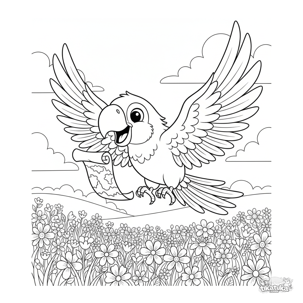 Página para colorir para crianças mais velhas: um papagaio arara voando com um mapa sobre um prado florido. Cena detalhada no estilo de livro ilustrado.