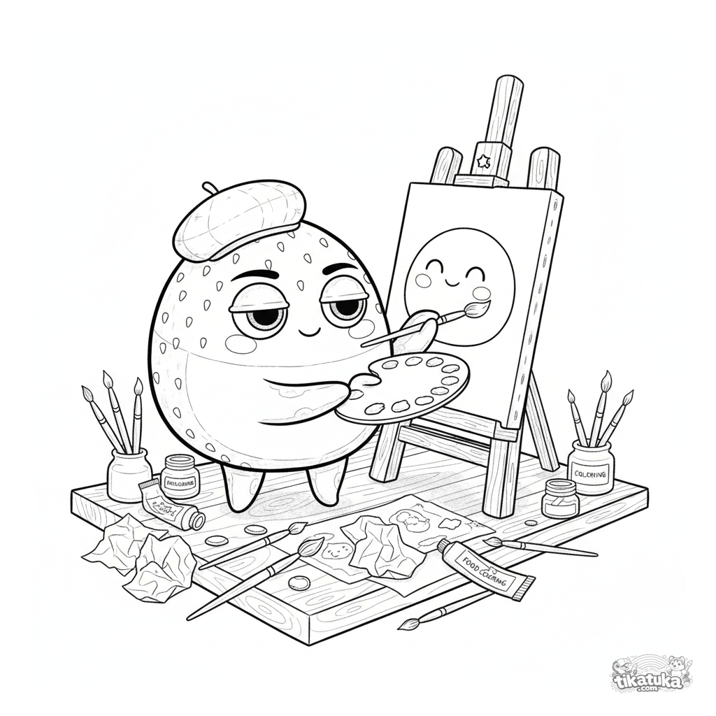 Página para colorir complexa: um mochi artista de morango pintando um quadro em seu estúdio. Cena detalhada em estilo esboço aquarela para crianças mais velhas de 10-12 anos.