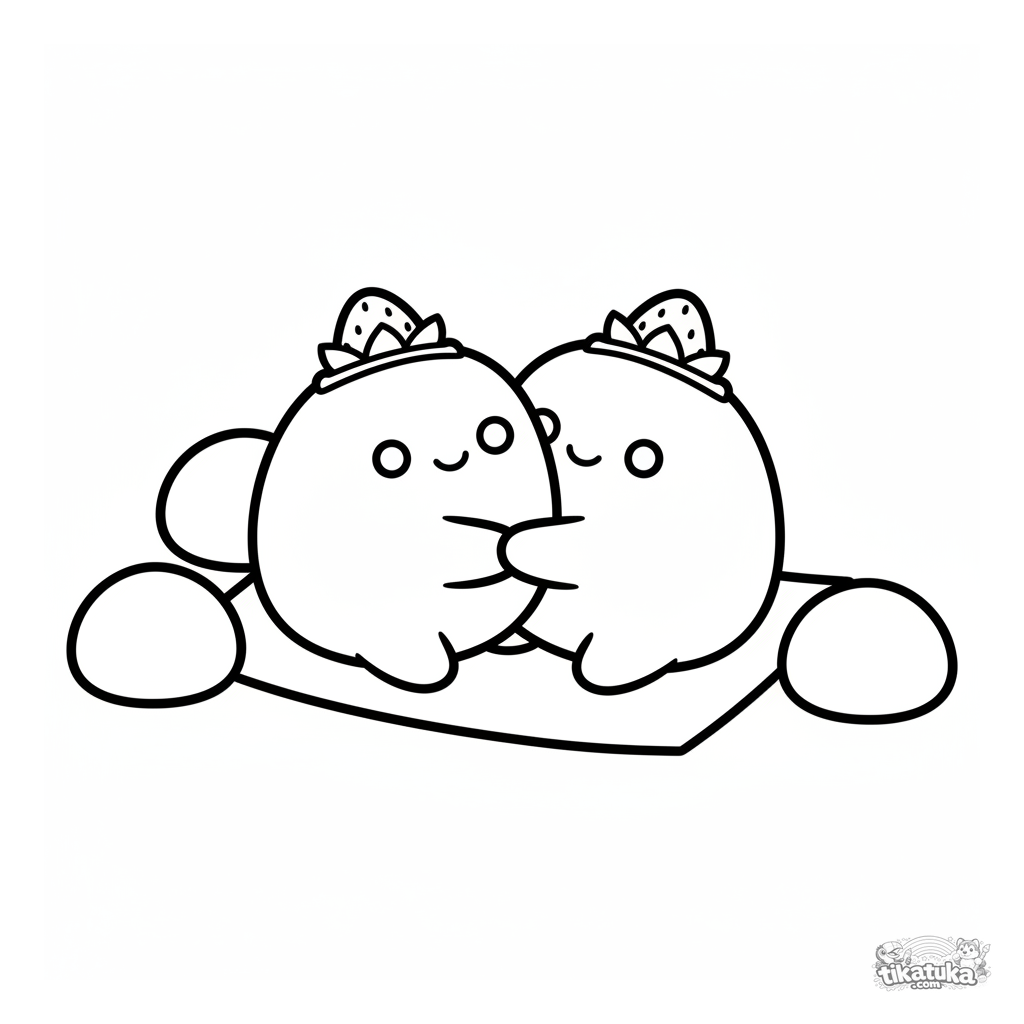 Página para colorir para crianças pequenas: dois mochis de morango fofos se abraçando em uma folha de papel de arroz entre outros mochis. Formas simples e margens amplas.
