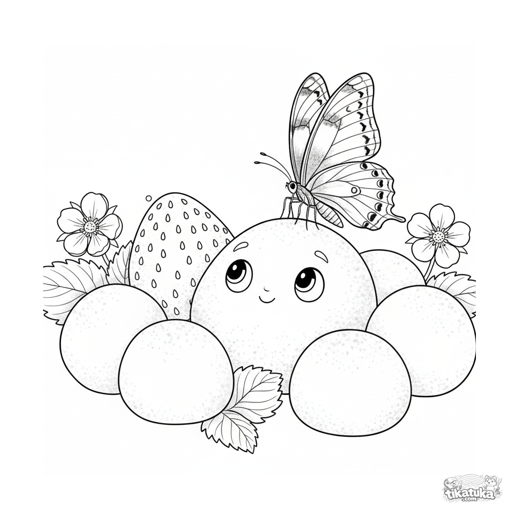 Página complexa para colorir para 10-12 anos: um mochi de morango observa uma borboleta. Cena detalhada em estilo esboço aquarela entre flores.