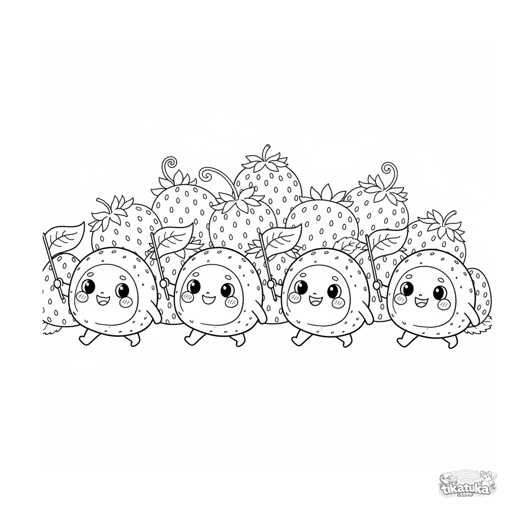 Página para colorir detalhada para crianças de 10 a 12 anos: um desfile de mochis de morango com bandeiras de folhas. Contornos realistas, cena complexa.