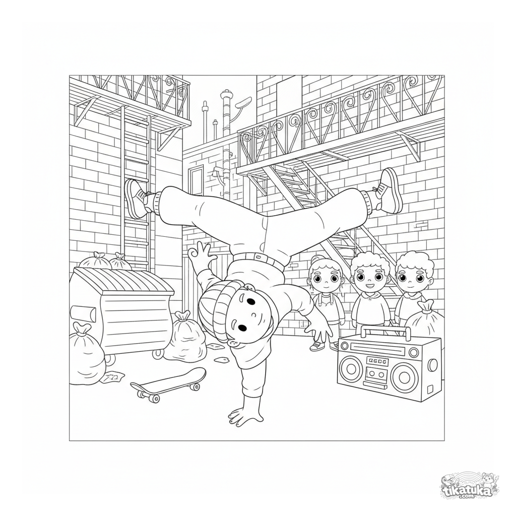 Página para colorir detalhada: um dançarino de rua executa um movimento de breakdance em um beco da cidade com paredes de tijolo e amigos ao fundo. Para crianças de 7 a 12 anos.