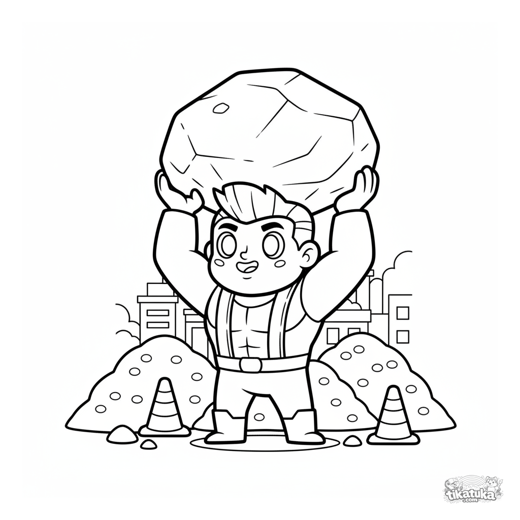 Página para colorir para crianças 4-6: um herói da força levanta uma grande pedra em um canteiro de obras, ajudando no trabalho.