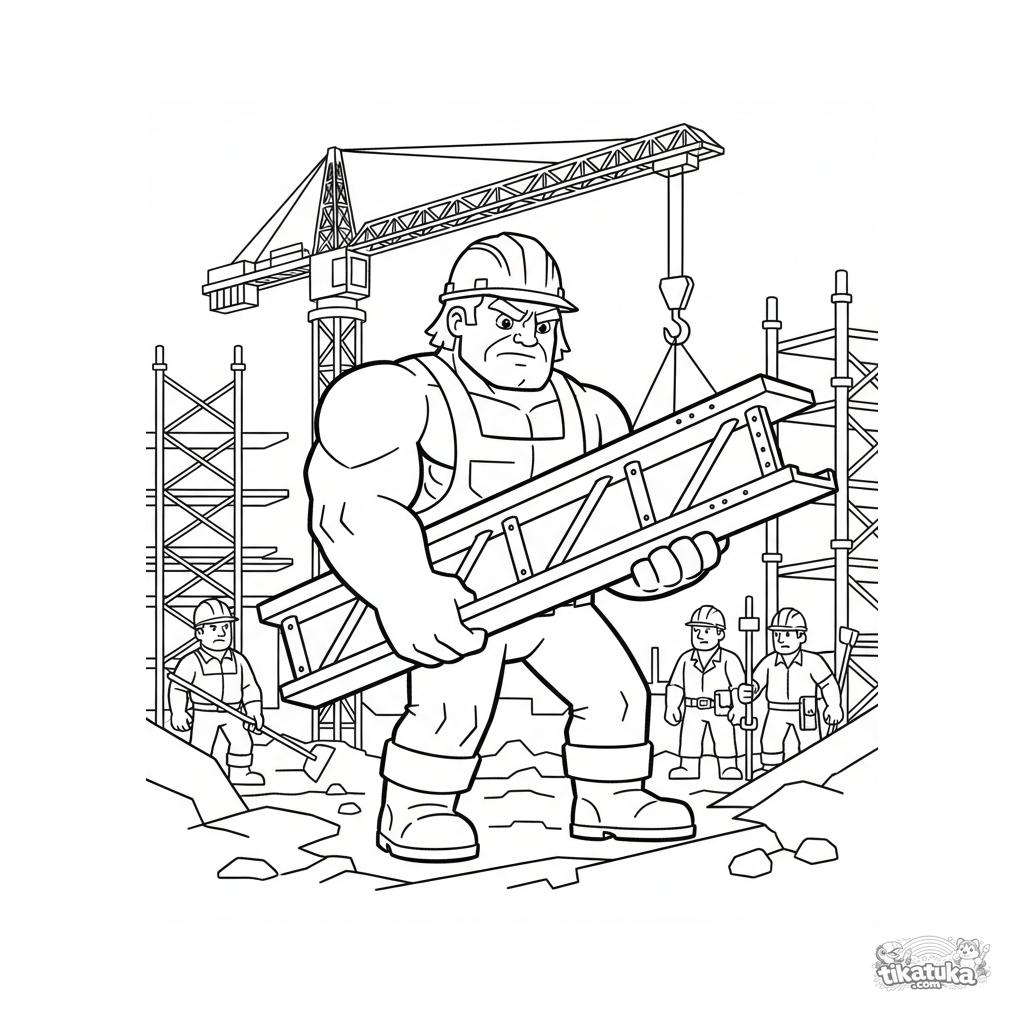 Página para colorir de um super-herói forte levantando uma viga em um canteiro de obras. Para crianças de 4 a 6 anos.