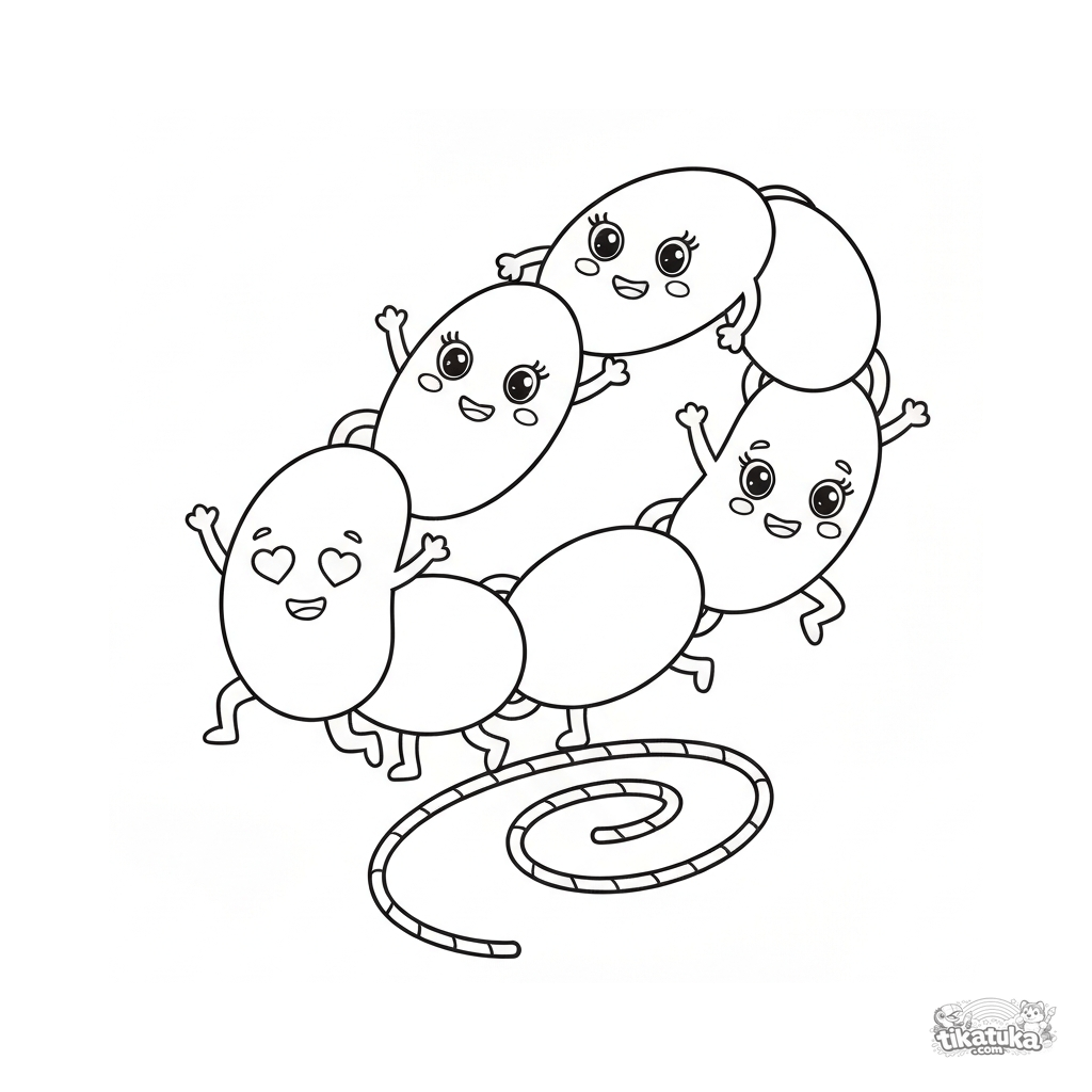 Página para colorir para crianças. Cadeia feliz de micróbios estreptococos com olhos de coração pulando corda juntos. Download grátis.
