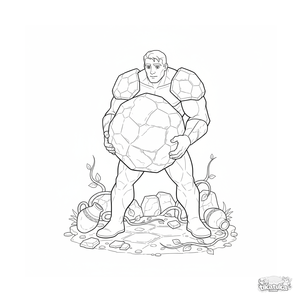Página para colorir para 10-12 anos: um super-herói de força com armadura de pedra levanta um pedregulho para abrir caminho em ruínas antigas. Cena realista e detalhada.