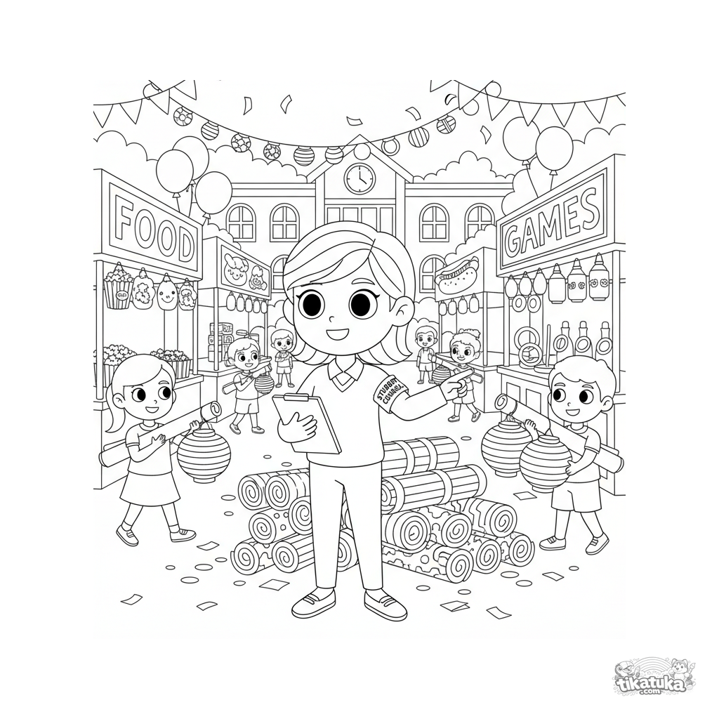 Página para colorir estilo retrô anos 90: o presidente do conselho estudantil organiza o festival escolar no pátio. Cena animada com múltiplos personagens e detalhes para 10-12 anos.