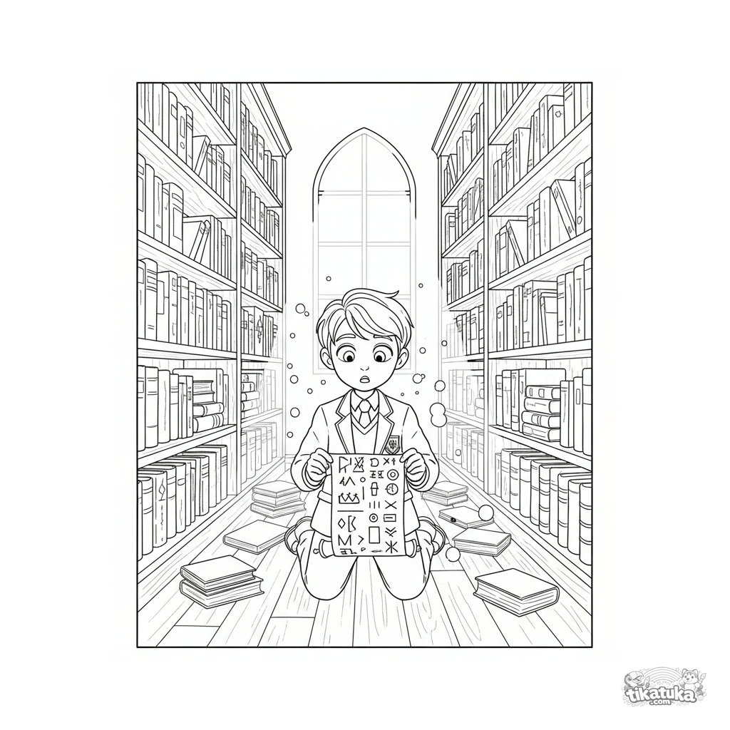 Página detalhada realista estilo anime para 10-12 anos: um estudante investiga um pergaminho antigo em uma biblioteca gigante. Cena complexa com livros, luz e atmosfera de mistério.