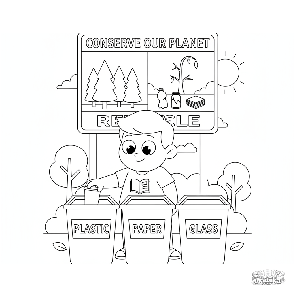 Página para colorir para crianças de 4-6 anos: um estudante separa corretamente o lixo em diferentes lixeiras em uma placa educativa de conservação do zoológico. Ensina o básico de ecologia.