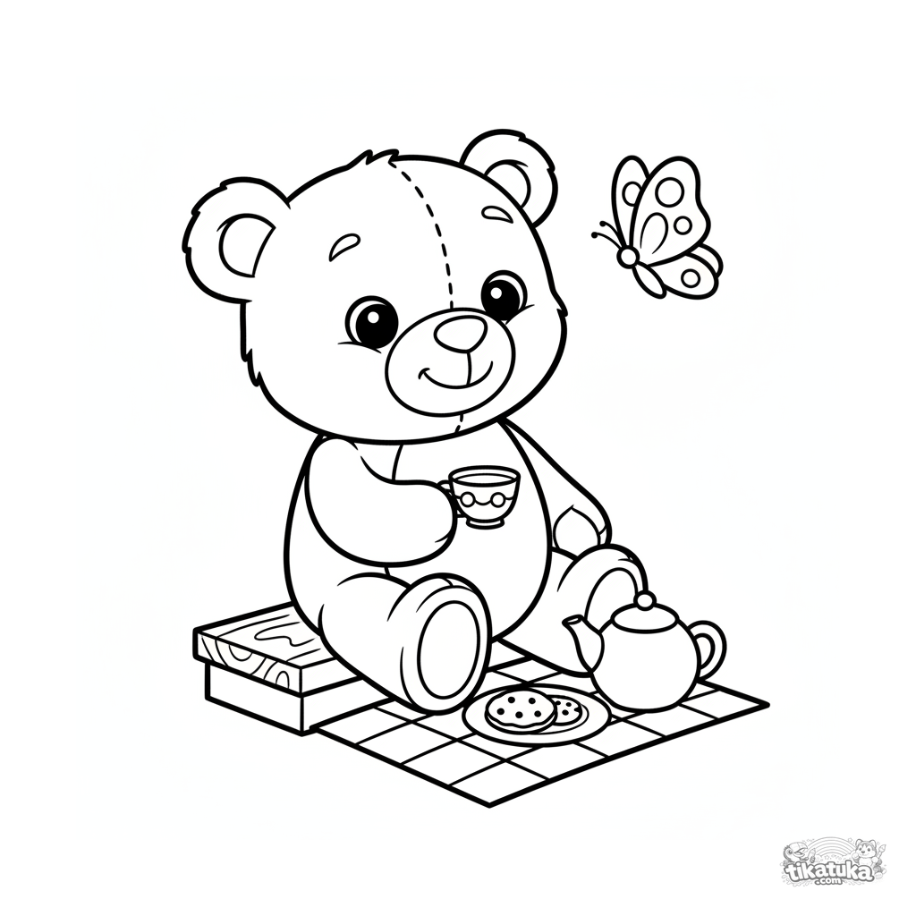 Página simples para colorir para crianças pequenas 2-3: um grande urso de pelúcia senta no degrau da varanda tomando chá. Formas grandes, poucos detalhes, margens amplas.