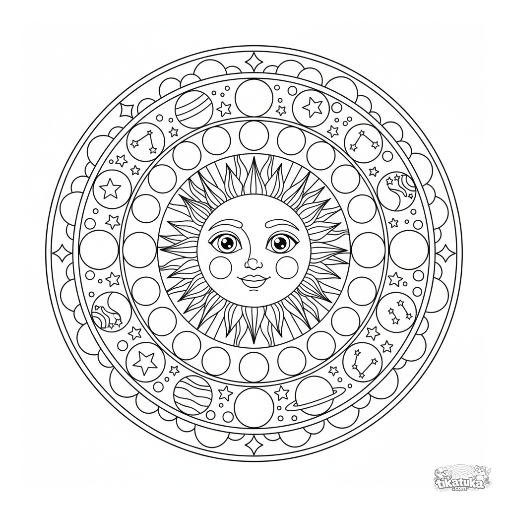 Mandala celestial detalhada de Sol e Lua para colorir, para idades 10-12. Rosto do sol, fases da lua, anel de estrelas e constelações, simetria de quatro partes.