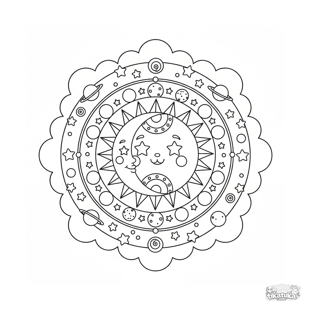 Página para colorir de mandala celestial intrincada que une o sol, a lua e os planetas. Um design cósmico geométrico no estilo construtivista para crianças de 10 a 12 anos.