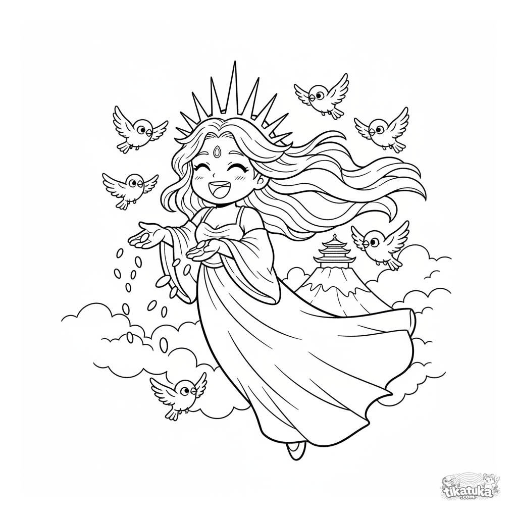 Página para colorir para crianças: uma deusa do sol voa pelo céu com companheiros pardais acima de um templo da montanha. Cena brilhante e alegre de mitos.